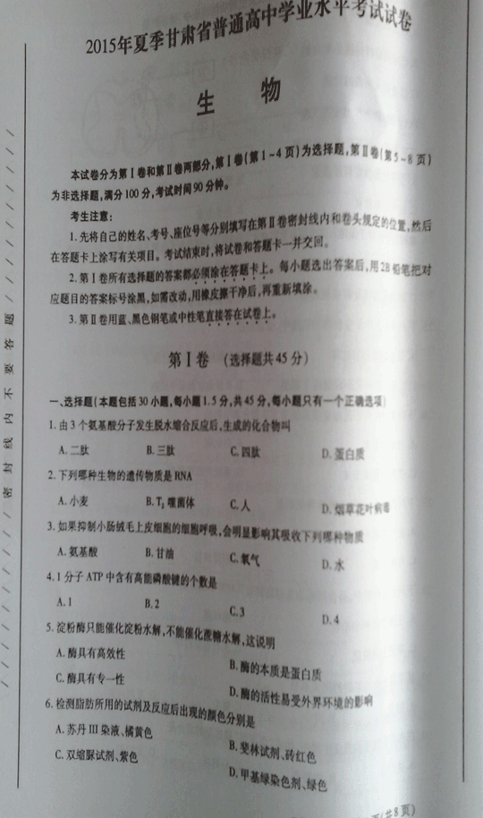 甘肅省2015年夏季高中學(xué)業(yè)水平考試生物試題卷